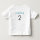 Camiseta de cumpleaños con tema de carrera divertida con ilustracion acuarela de auto azul vintage con llamas rojas. El texto de la parte delantera dice "DOS RÁPIDO" y puedes añadir el nombre y la edad de tu hijo en la parte posterior.