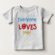 A cute, fun, colorful text design on T-shirts, bodysuits, raglan T-shirts, hats, sleeveless dresses, ruffle shirts and dresses, organic bodysuits, sweatshirts, pullover hoodies, dark T-shirts, and other apparel that reads Everyone Loves Me with text of blue, red, and gold.
