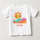 Personalized cheerful and vibrant summer baby t-shirt. It features a friendly smiling sun peeking over a series of colorful, flowing rainbow waves in a hand-drawn style. This charming piece makes a perfect gift for a boho-themed baby shower or a first birthday celebration.