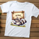 Esta divertida camiseta personalizada para bebé presenta un lindo mapache sosteniendo un letrero de nombre de madera de gran tamaño, Con una cola esponjosa hacia afuera para mantener el equilibrio, un pie levantado a mitad de tropezón, este adorable diseño es perfecto para personalizar.