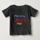 Mamá me ama camisetas oscuras, tés de manga larga, sudaderas y capuchas de pullover para bebé con texto de rojo, azul y oro con un corazón que lee ¡Mamá me ama!