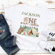 Camiseta para fiesta de cumpleaños número uno con tema de camping para bebé niño con un oso marrón y zorro, hoguera y tienda de campaña y texto de madera. Ideal para una fiesta de cumpleaños número uno con tema de camping.