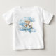 Una camiseta de bebé adorable y suave perfecta para celebrar el primer cumpleaños de tu pequeño o su baby shower. Esta camiseta blanca presenta una ilustración caprichosa de acuarela de un osito que lleva un sombrero de piloto, volando un avión vintage azul claro a través de las nubes. Es personalizable con el texto "Cumpleaños de [Nombre del Niño]", lo que la convierte en un atuendo memorable para el cumpleañero o un regalo encantador para un pequeño aventurero.