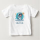 Camiseta de bebé personalizada con un lindo niño astronauta en la luna con un planeta y estrellas sonrientes.