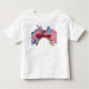 El patio se convierte en a veces un campo de batalla. Su pequeño soldado de caballería se destacará en este diseño fresco de la camiseta con la unión y las banderas americanas apenadas con el mosquete y la espada.