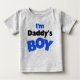 Soy camisetas de papá, tés de manga larga, trajes de ropa que incluyen trajes orgánicos, y trajes de fútbol, gorras, enterizos, polos oscuros, camisetas raglan y otras prendas con un brillante diseño de texto azul y negro que dice ¡Soy el chico de papá!