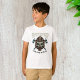 Una cara atemorizante con una máscara con fuego de bomberos y rescate a su alrededor. Este diseño se ve realmente efectivo en esta camiseta para niños