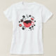 Esta camiseta presenta un diseño caprichoso que combina dos de las más grandes comodidades de la vida: café y gatos. Un gato negro dulce y de ojos amplios asoma desde una taza de café rojo vibrante, rodeado de granos de café, flores y deliciosos donuts. Es la camisa perfecta para cualquiera que empiece su día con amor por la cafeína y un amigo peludo.