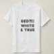Esta camiseta presenta un diseño audaz y patriótico con la frase "RED WHITE & TRUE" en letras mayúsculas. Encima del texto hay una imagen de la bandera de los Estados Unidos en escala de grises. El diseño evoca un sentido de orgullo nacional y es perfecto para aquellos que quieren mostrar su amor por Estados Unidos. Esta camiseta, hecha con tejidos de alta calidad y cómodos, es ideal para el desgaste casual y hace una declaración fuerte.