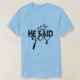 Celebra tu compromiso con esta encantadora camiseta azul claro que presenta la divertida frase "Él dijo que sí". El diseño incluye una combinación de letras en bloque audaces y fuentes cursivas elegantes, acentuadas con un simple gráfico de rama de hoja. La tipografía negra se destaca maravillosamente contra el fondo azul pastel, lo que hace que esta camiseta sea una opción perfecta para fiestas de compromiso, eventos de boda o simplemente para usarla en el día a día y compartir tus felices noticias. Muestra tu historia de amor única con esta camiseta elegante y significativa.