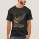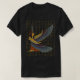 Camiseta que presenta a Ma'at sentada con alas extendidas y la pluma de avestruz en la cabeza. Este diseño de Ma'at tiene a la diosa egipcia en el centro de un fondo de jeroglíficos egipcios.