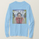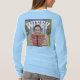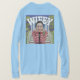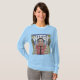 Camiseta Wifey Blue Long Sleeve T-Shirt La obra de arte muestra el ilustracion cómico de una mujer bonito con ojos azules. Ella está sentada en la escalera delantera de una casa y sonriendo. Ella lleva puesto un suéter rayado rojo y blanco y una bufanda verde. El fondo es un patio con árboles y un cielo azul. La palabra Wifey está en grandes letras blancas. La imagen está en la parte delantera y trasera de la camiseta. Puede cambiar la imagen con el botón Personalizar.