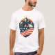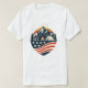 Un diseño al aire libre único que presenta montañas, una fogata y una tienda de campaña con un estilo de bandera estadounidense vintage. Perfecto para los amantes del camping, excursionistas y personas que disfrutan de la naturaleza y el espíritu americano.