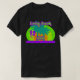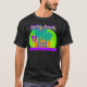 Colores brillantes frescos de las vacaciones de primavera 1989 de las características de neón de la camiseta 80s, arco iris de neón, gente que salta en la acción y dos palmeras desapasibles.