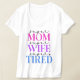 Camisas de mujeres personalizados con "Super mamá, superesposa, súper cansada" en colorida tipografía mixta. Hay varios estilos y colores disponibles.