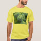Hydrangeas azules preciosos en la plena floración en la camiseta amarilla veraniega.