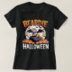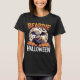 El sonriente dragón barbudo con alas de murciélago se sienta en una roca, rodeado de linternas de jack-o', árboles desnudos y murciélagos bajo una luna llena de brillo. Un juguetón diseño de Halloween.