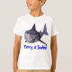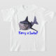 La camiseta con un tiburón sonriente divertido, del dibujo animado del estilo que mira hacia fuera el espectador, y las palabras "desea una nadada?"