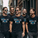 Camiseta divertida de despedida de soltero azul, negra y blanca para el novio y sus amigos. ¡Consigue una para cada miembro de tu grupo de amigos!