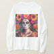 Este hermoso diseño del Día de los Muertos cuenta con una mujer con intrincada maquillaje de cráneo de azúcar, enmarcada por vivos flores naranjas, rosadas y moradas. Perfecto para celebrar el espíritu festivo de la vida y la muerte con elegancia y color.