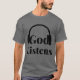 Esta camiseta muestra las palabras "Dios escucha" en una letra audaz con letras negras mostrando un conjunto de auriculares sobre la frase que Dios escucha en este estilo y tema basado en la fe. Esta camisa está hecha de 100% algodón, es unisex y se viste bien con cualquiera y con todos. Doble costura en el dobladillo de la parte inferior y las mangas para hacerla más resistente.