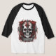 El diseño presenta una obra de arte oscura con un cráneo blanco y rojo empalado con una espada de plata con mango negro. La sangre se representa goteando por ambos lados del cráneo. Un marco decorativo rojo abarca el cráneo y un cartel ensangrentado en la parte inferior muestra la palabra "Muerte Metalizado". El fondo de la imagen es negro, lo que confiere una atmósfera agresiva y algo inquietante a la escena.