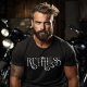 Una camiseta de diseño de tipografía con la palabra Ruthless en ella en grandes letras plateadas ornamentadas.
