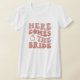 Camiseta Divertida y Linda de Despedida de Soltera para la futura novia. Texto simple que dice Aquí viene la novia con letras rosadas y un anillo rosa.