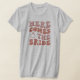 Camiseta Gris Divertida y Linda Despedida de Soltera para la futura novia. Texto simple que dice Aquí viene la novia con letras rosadas y un anillo rosa.