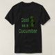 Un pepino verde gracioso de pie con los brazos doblados y una sonrisa descarada en la cara. Lleva puesto un chaleco negro, botas marrones y tonos negros. A un lado y debajo de él están las palabras "Guay As A Cucumber" con letras verdes.