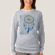 Esta camiseta gris de manga larga presenta una imagen estética de un soñador. El dreamcatcher tiene delicadas plumas azules y lavanda y acentos metálicos de oro. El fondo es una plata metálica con textura y gradientes suaves. El estilo es Art Nouveau y contemporáneo. La imagen es una bonita composición de buena calidad.