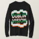 DUBLIN over VISION commands the center in heavy caps, set on a jagged, pixel-block white plaque. Green with orange offsets fracture and echo the letters with glitchy VHS vibes, while streaks and thin bars radiate outward against deep-black bold impact.