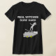 Imagen de silueta de una bruja balanceando en una escoba surcando los cielos tormentosos. Nubes grises con relámpagos amarillos. Texto Real Testigos Surf Duramente. Camisetas únicas y divertidas para mujeres hermosas, damas, chicas y otros personajes femeninos valientes. ¡Personalizable. Puede cambiar la imagen y puede cambiar o eliminar el texto de la plantilla Real Witches Surf Hard. No olvide elegir otro estilo y color de un funda. Diviértete.