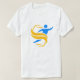 A clean white T-shirt featuring a bold, modern graphic of a stylized human figure in motion. Flowing blue and golden swooshes create a sense of energy, balance, and progress, making the design ideal for sports, fitness, wellness, or motivational themes. The minimalist color palette keeps it versatile and eye-catching, suitable for casual wear, athletic branding, or promotional use