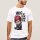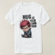 Esta prenda de vestir blanca tiene un personaje de anime personalizado con el pelo rojo picante y una expresión gruñón, sentado con los brazos cruzados. El texto de arriba dice "ABRAZO A TU PROPIO RIESGO". Es un diseño humorístico con una vibración atrevida y estadista, que probablemente atrae a los fans del anime o a los que tienen un sentido del humor similar.
