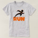 Corriendo camisetas, tazas, bolsos, agujeros, camisetas de tanques, carros y otras prendas de vestir y regalos para corredores con un corredor de siluetas negro y texto naranja que dice RUN. Estas prendas de vestir y artículos de regalo son geniales para cualquiera que entrene para un 5K, cualquiera que sólo ame correr, o alguien que ya ha logrado varias maratones!