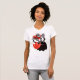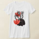 La camiseta de las mujeres lindas del monstruo con una criatura negra del dibujo animado con cuatro ojos en troncos rayados blancos y negros largos que sonríe, ocultada en tulipanes rojos abstractos.