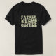 Esta imagen muestra una camiseta negra con el texto "PADRE NECESITA CAFÉ" escrito en un tipo de letra retro, burbujeante y blanquecina. Las pequeñas formas de starburst están diseminadas alrededor del texto.