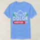 El color es muy bonito al natural, como la foto. El tejido es suave y de buena calidad. Sin defectos en el tintado, ni hilos sueltos o descosidos. Bien la impresión. Los bordes de las letras y el dibujo son nítidos, y el color contrasta muy bien con el de la camiseta.