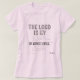 Camiseta con el verso en Salmos 18:2, "El Señor es mi roca en la que confiaré" en la espalda en la tipografía de moda.