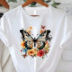 The colorful floral accents and artistic butterfly illustration give this tee a fresh, feminine, and nature-inspired style, perfect for everyday wear. Whether you're heading out for a casual day, enjoying a spring outing, or relaxing on a summer afternoon, this shirt adds a touch of charm and elegance to any outfit.