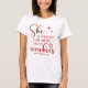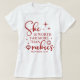 Esta cita de Proverbs 31:10 está hecha en rojo rubí. "Ella vale mucho más que los rubíes".