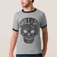 Un cráneo en un casco con, "la emoción de la velocidad supera el miedo de la muerte - móntelo como si usted se hubiera evadido con él," interior mano-indicado con letras. Gráfico blanco y negro, apenado.