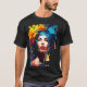 Esta imagen representa un retrato vibrante y expresivo de una mujer. La obra de arte incluye llamativas pinceladas dinámicas y una paleta de colores vivos, principalmente de tonos azules, naranjas y amarillos. El cabello de la mujer parece estar en movimiento, con salpicaduras de pintura extendiéndose hacia afuera, creando una sensación de energía y movimiento. Su expresión facial es serena pero intensa, con sorprendentes ojos azules que atraen la atención del espectador. El fondo es mínimo, lo que permite que el foco permanezca en el tema y los vivos colores que la rodean.