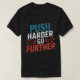 Esta camiseta negra muestra el motivacional texto "PUSH HARDER IR MÁS ALLÁ" apilado verticalmente en un tipo de letra negrita, ligeramente angustiado, con colores azul, blanco y rojo. Los elementos gráficos de una pancarta y un dobladillo están integrados en la palabra "GO", reforzando visualmente el tema del entrenamiento. El diseño alienta un mayor esfuerzo y progreso en la aptitud.