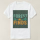 Un diseño de camisetas vibrante y juguetón con el texto "Forest Finds" (hallazgos forestales) en una letra audaz, de color arcoiris, con criaturas del bosque lúdico como ardillas y ciervos mirando desde los bordes