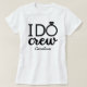 Haz que las personas geniales en tu corte nupcial se sientan extra especiales y apreciadas con estas camisetas personalizadas de boda. El diseño presenta las palabras "The I do crew" en un estilo de letra elegante pero moderno, camiseta minimalista de mujer en blanco y negro. La palabra 'do' presenta un anillo de diamantes lindo en lugar de la letra 'O' para significar el matrimonio de la novia y el novio. Debajo de esto hay un lugar sutil para el nombre del miembro del corte nupcial.
