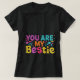 La camiseta ostenta una vibrante declaración de amistad. El texto "tú eres mi bestie" se muestra en una mezcla de neón y colores pastel, con una rúbrica de purpurina para añadir un toque de jazz. Este diseño es perfecto para celebrar a tu mejor amigo con estilo.