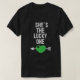 Este diseño de parejas del día de los trinitenses tiene un gráfico retro angustiado con un shamrock medio verde y dice Ella es la afortunada