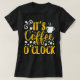 Es la hora del café en amarillo con acentos blancos: taza de café y granos de café.